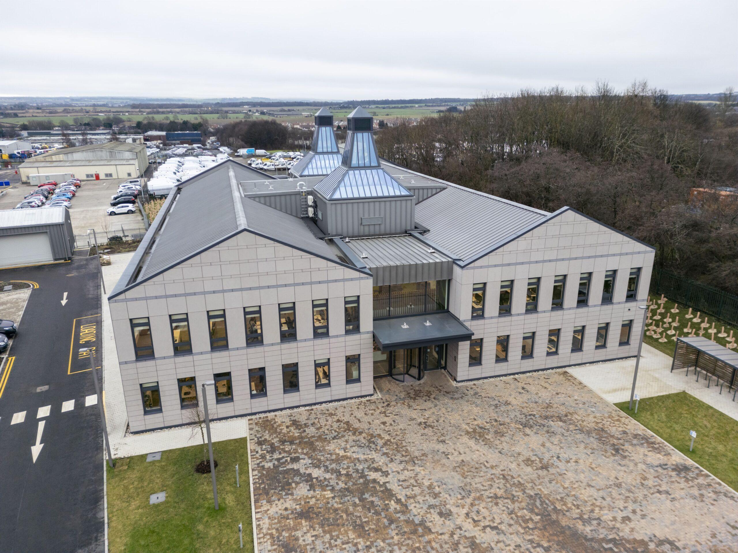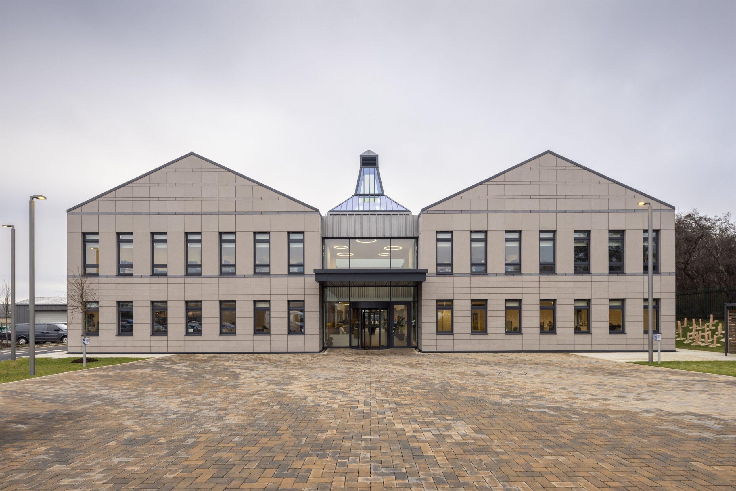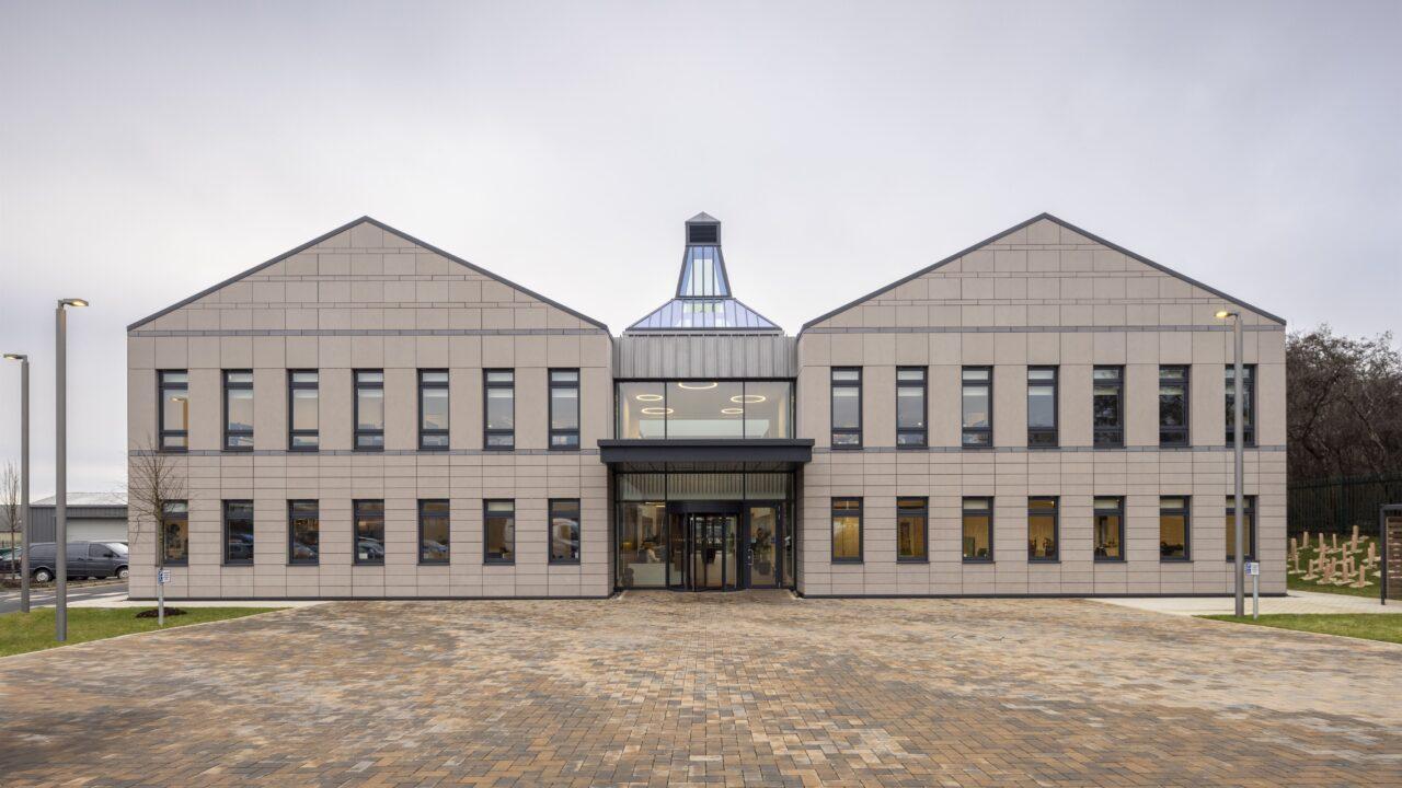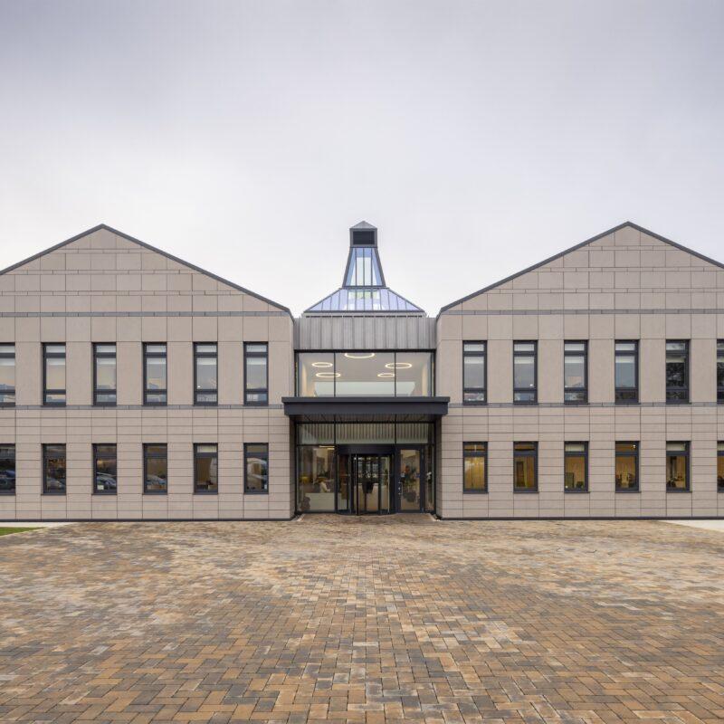 The steel framed building provides 21,000sq.ft. of accommodation across two wings linked by a glass atrium and includes office space and a bar area. Externally, the new HQ features two glazed lantern roof lights, modelled on the Doig Ventilator or ‘pagoda roof’, to reflect the characteristic of whisky distilleries.