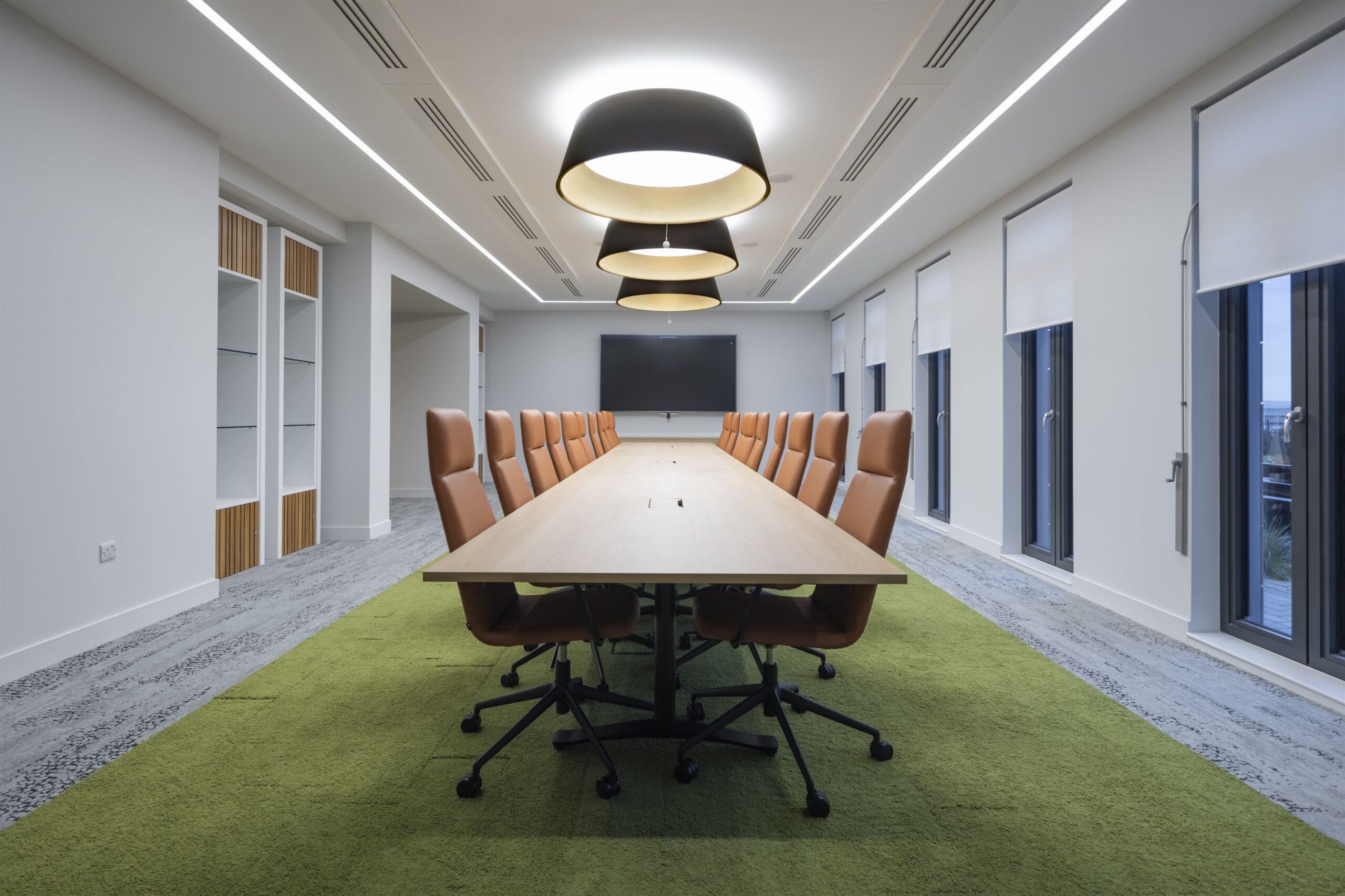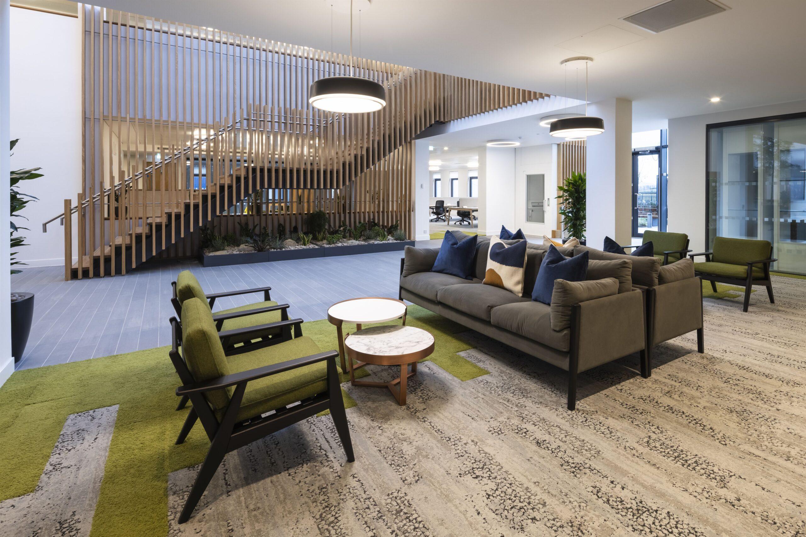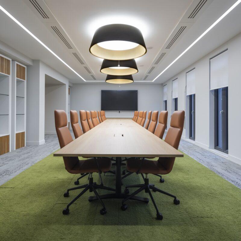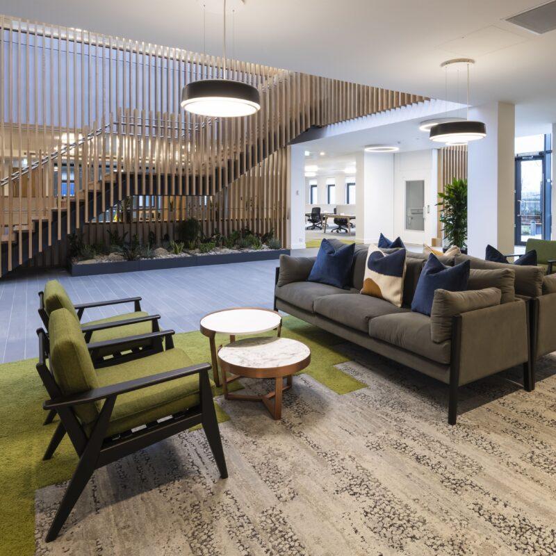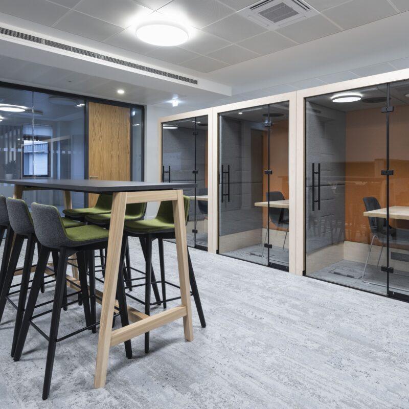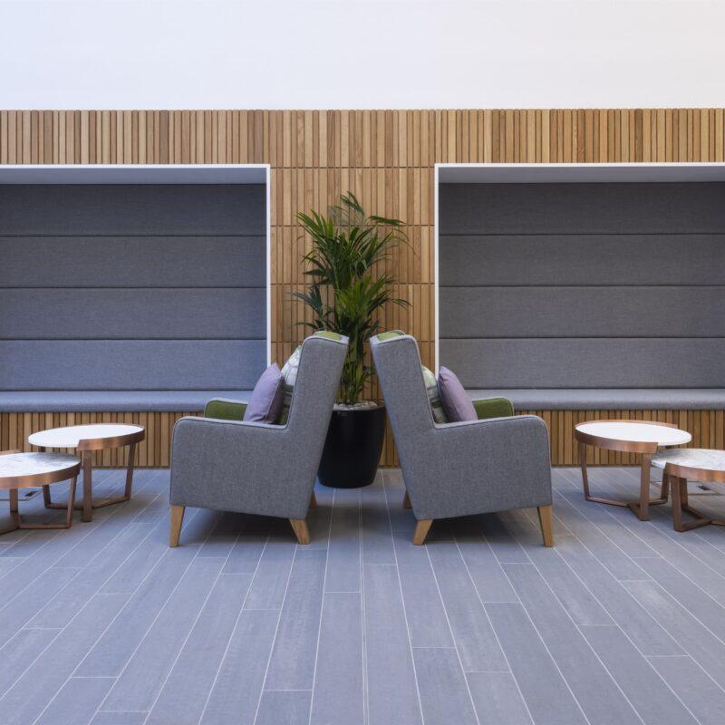As part of the project, Clark Contract’s in-house Manufactured Joinery Division delivered a bespoke furniture package, including a reception desk, boardroom display units, timber screens and cladding.